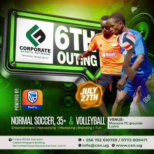 The sixth outing on the Corporate Sports Network calendar happens on Sunday, July 27, at the Maroons FC grounds in Luzira. The fixture list shows that teams will compete in football (normal and 35+) and volleyball.